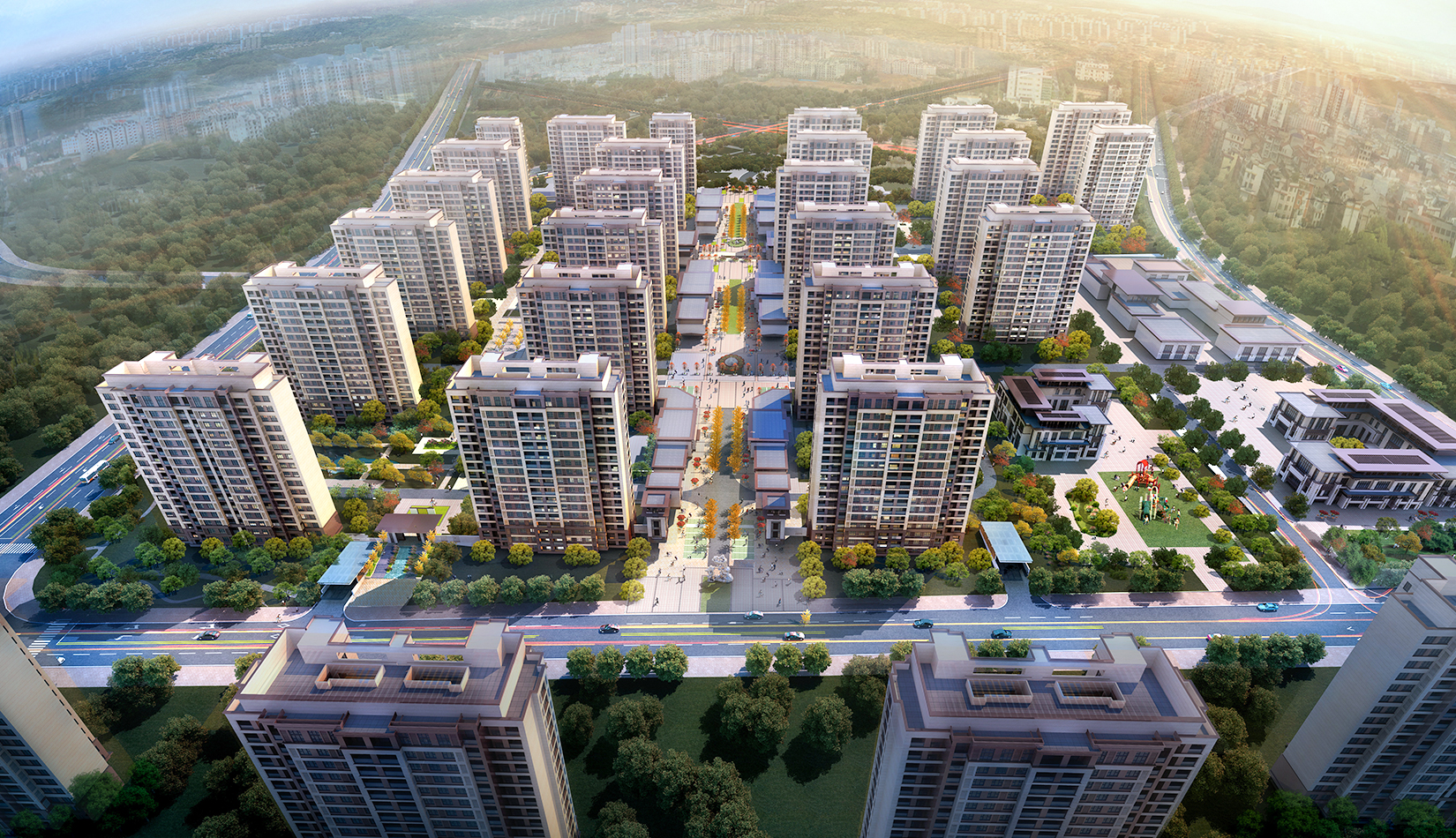 該項目尊重已有地塊規(guī)劃設計,保留原有空間功能軸線、大小平嶺村安置區(qū)布局;根據(jù)周邊用地、交通情況布局配套商業(yè)、幼兒園。