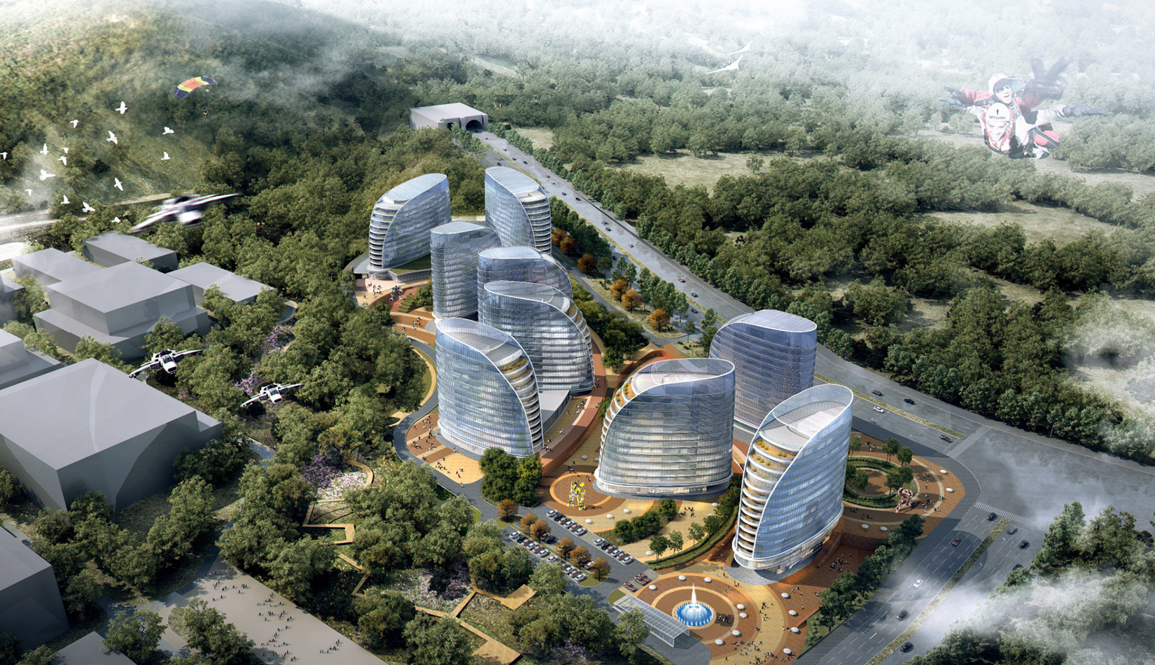 注重地塊內空間環(huán)境的滲透和景觀視線效果,保持地塊環(huán)境與城市環(huán)境的共融性,提升城市空間價值。建筑外觀采用簡潔、現代的風格,立面形象富有視覺沖擊力,樹立企業(yè)品牌與形象。高層建筑層層平臺向景觀蔓延,為人們提供豐富多變的生活工作空間。底層平臺上的文化內街,結合影視特色主題,聚集人氣,串聯互動。曲線連廊內部空間流動,成為具有活力的公共交往場所。