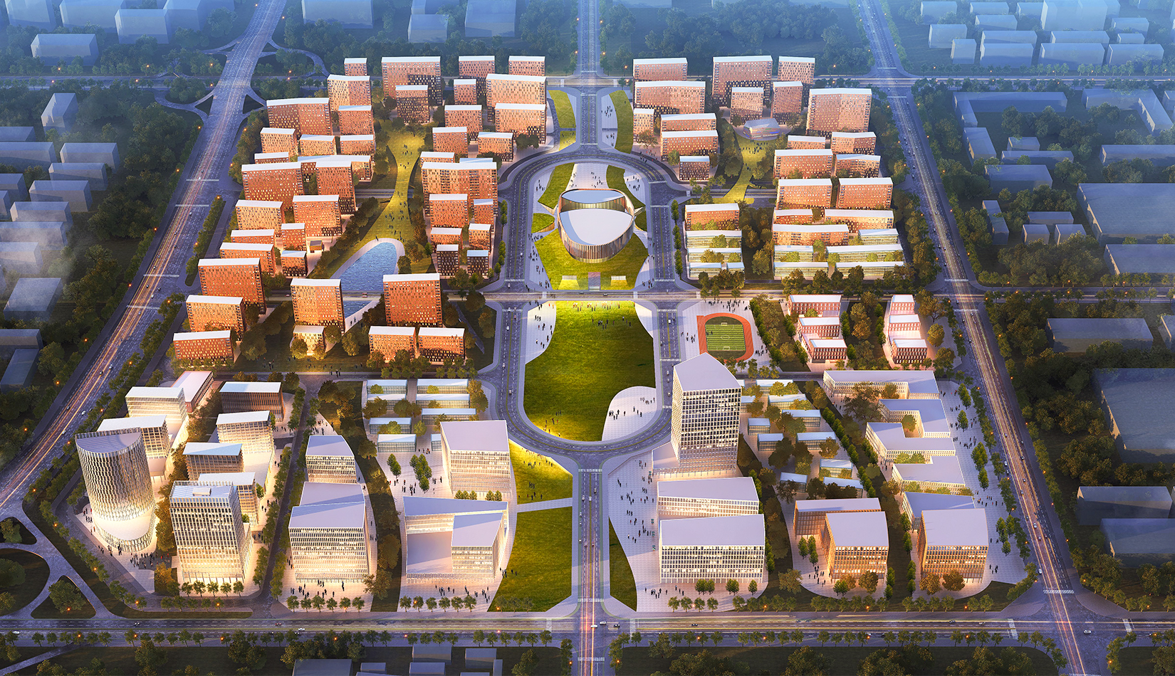 生態(tài)規(guī)劃以“生命之樹“為主題,以南側(cè)的“安全生產(chǎn)管理研發(fā)區(qū)域”作為科學(xué)基礎(chǔ),以“三生”安全景觀軸為貫穿南北,并與遠(yuǎn)處的泰山遙遙相應(yīng)。自西往東,三大安全景觀軸分別象征“生態(tài)”、“生機(jī)”和“生活”:西側(cè)軸線整合現(xiàn)狀水塘及古井,使之成為景觀的一部分,結(jié)合濃密的種植,充分展現(xiàn)生態(tài)主題;中央?yún)^(qū)域廣場綠地景觀帶與體育文化場館相配合,強(qiáng)調(diào)了健康、運(yùn)動(dòng)的生機(jī)氣象, 展示生命健康與安全的信息和設(shè)施;東側(cè)的景觀帶側(cè)與學(xué)校串聯(lián),結(jié)合住宅小區(qū),為人們提供全天候的戶外生活場所,展示生活安全理念和技術(shù)。景觀帶延綿起伏,在道路交匯處延續(xù)地景設(shè)置人行設(shè)施,確保步行的安全。