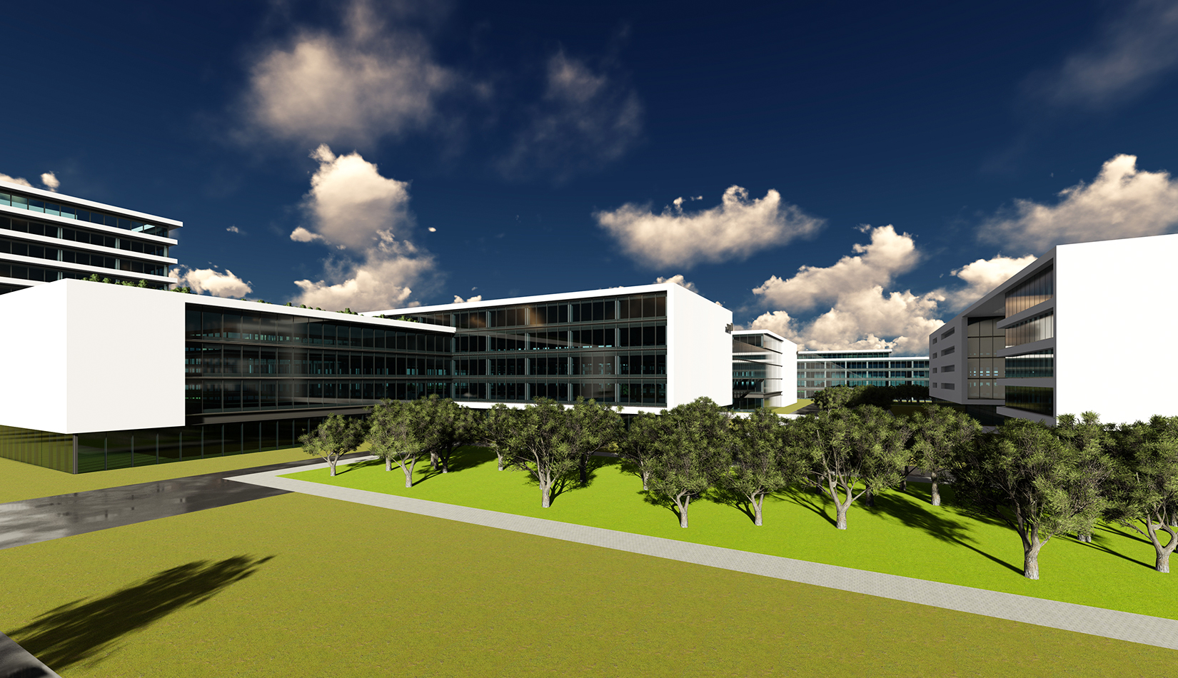用全圍合式布局,形成兩個能量環(huán),為整個園區(qū)輸送無限動力?;盍θh(huán)的自由、靈活的建筑布局形式,為多元化的企業(yè)辦公提供各種空間選擇。活力三環(huán)均與雙核中心相連,在吸取核心研發(fā)產(chǎn)業(yè)鏈能力同時,不斷提升自己,向雙核中心注入新活力。通過五環(huán)的建筑空間形式,將多元功能塊組合在一起,形成一個共生循環(huán)系統(tǒng)。