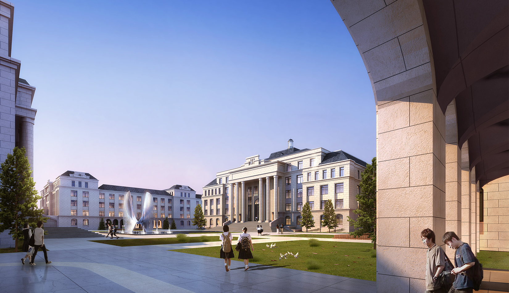 景觀設(shè)計(jì)引用了《禮記聘義》中對(duì)玉的六大特征:“禮”“知” “樂(lè)” “信”“義”“仁”作為景觀主題植入學(xué)校各個(gè)重要空間。