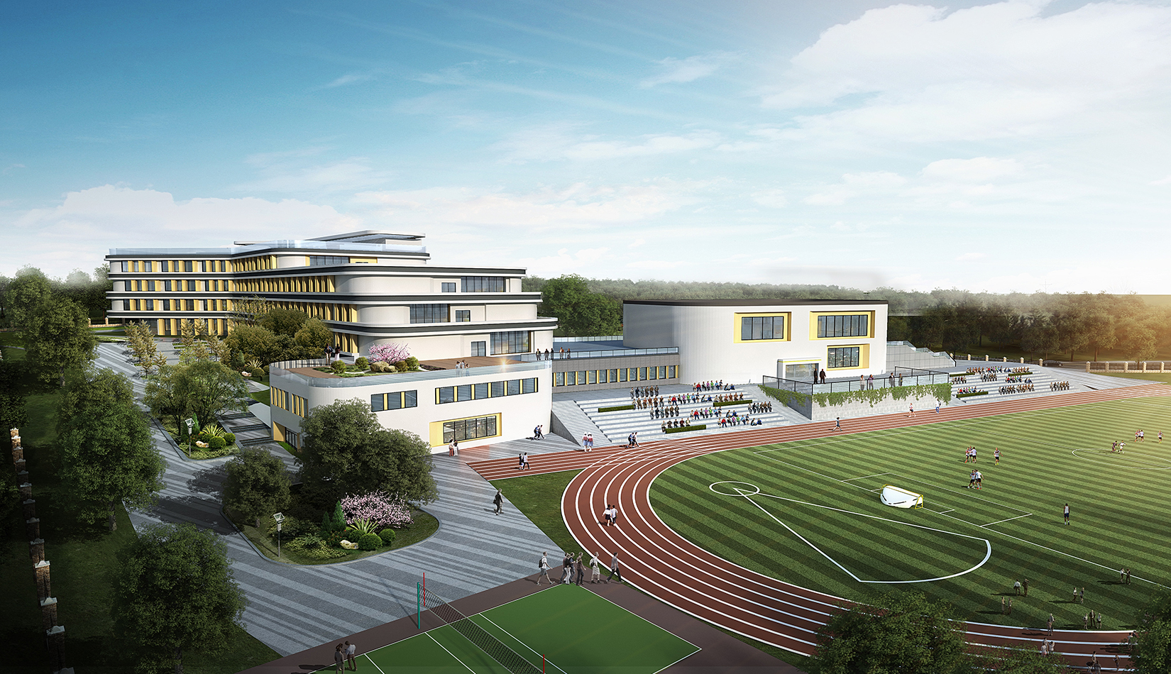 功能分區(qū)遵循“教學—觀演—運動”三點式布局原則,各功能之間聯(lián)系緊密,流線合理清晰。不再鋪設(shè)走廊,將連接性空間設(shè)計成“學習小徑”,從而創(chuàng)造更實用的空間以及一個更有效的建筑,同時營造出一種“學習無處不在”的氛圍。