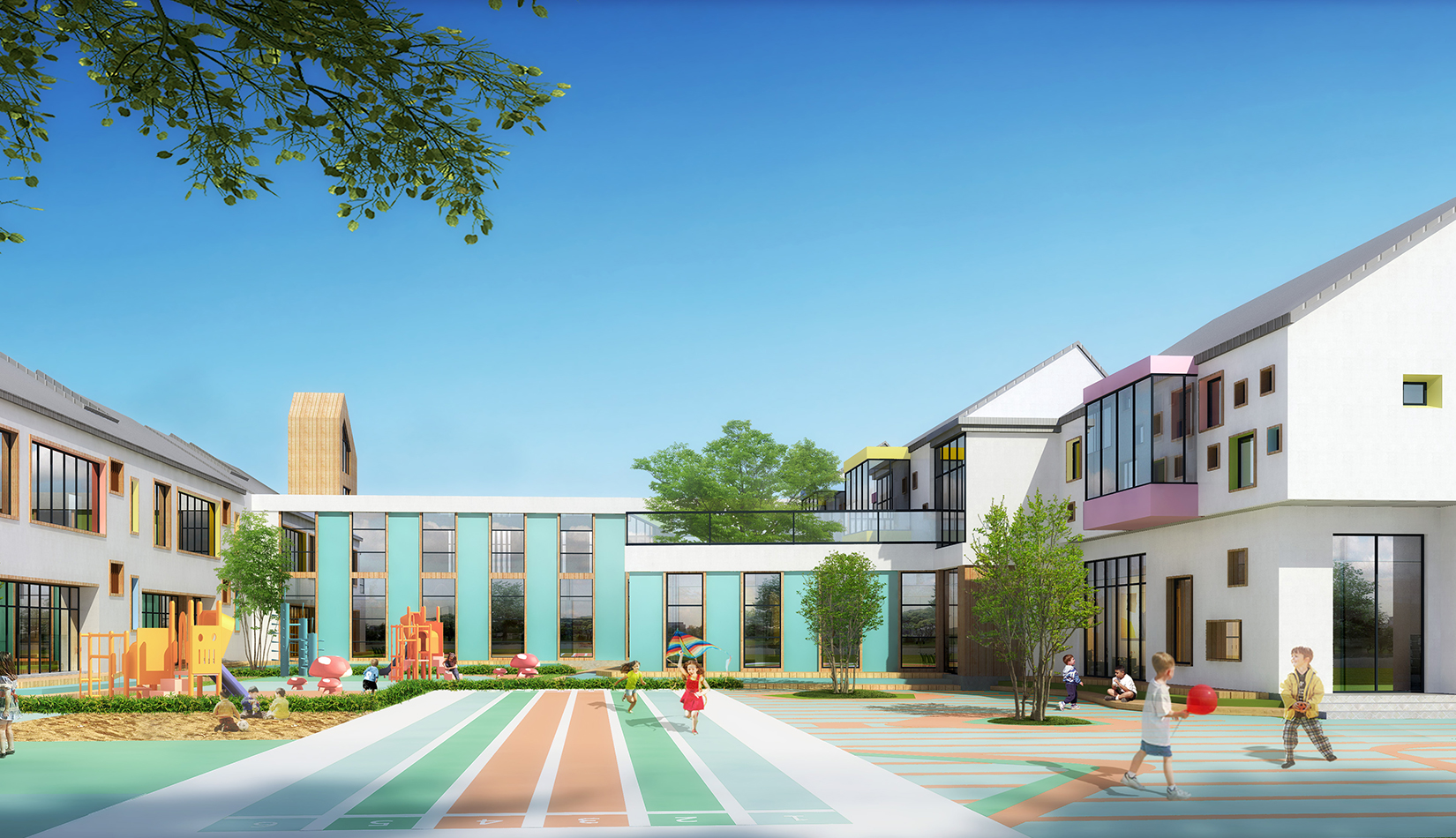 建筑造型來源于兒童最初對房子的印象并進行延伸,加上積木搭接形態(tài),形成C字形圍合的主體建筑,就像父母溫暖的懷抱;建筑造型跟兒童產(chǎn)生很好的親切感,讓兒童將上幼兒園成為快樂的事情。同時形態(tài)結(jié)合地緣文化特色,采用雙折坡屋頂,寓意展翅翱翔的海鷗。