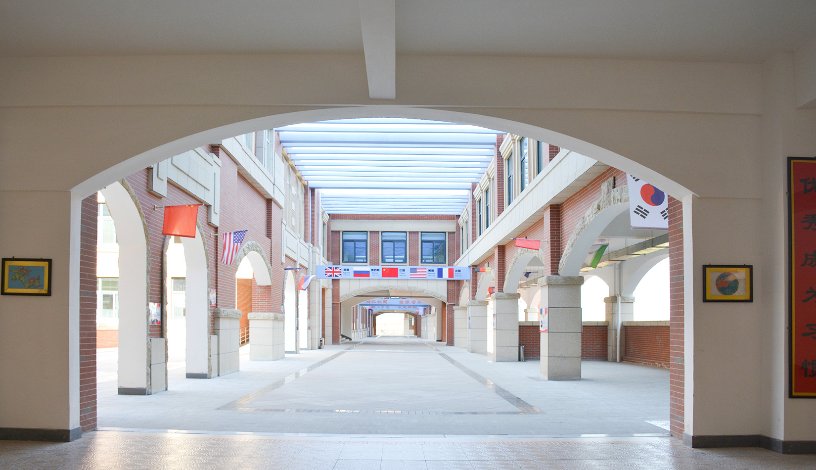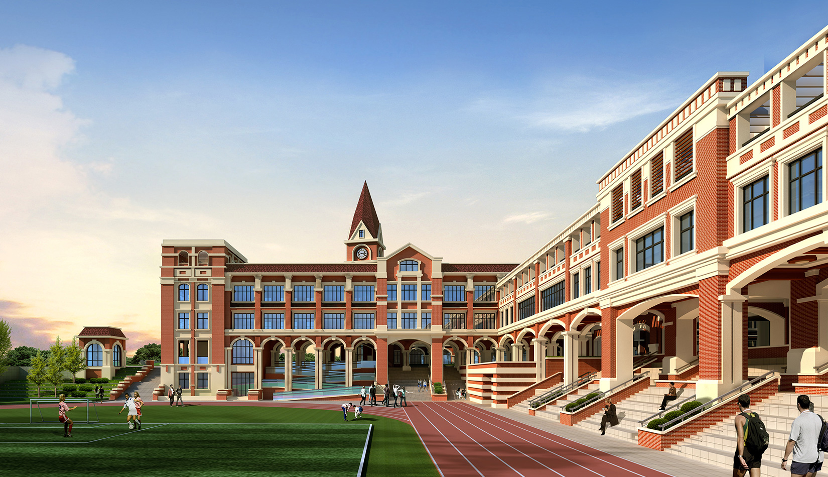 校園建筑風(fēng)格采用簡約歐式風(fēng)格,以明亮、歡快的紅磚作為校園主體色調(diào),通過淺色石材、線腳的穿插勾勒建筑輪廓,形成極具特色的歐式花園式校園。