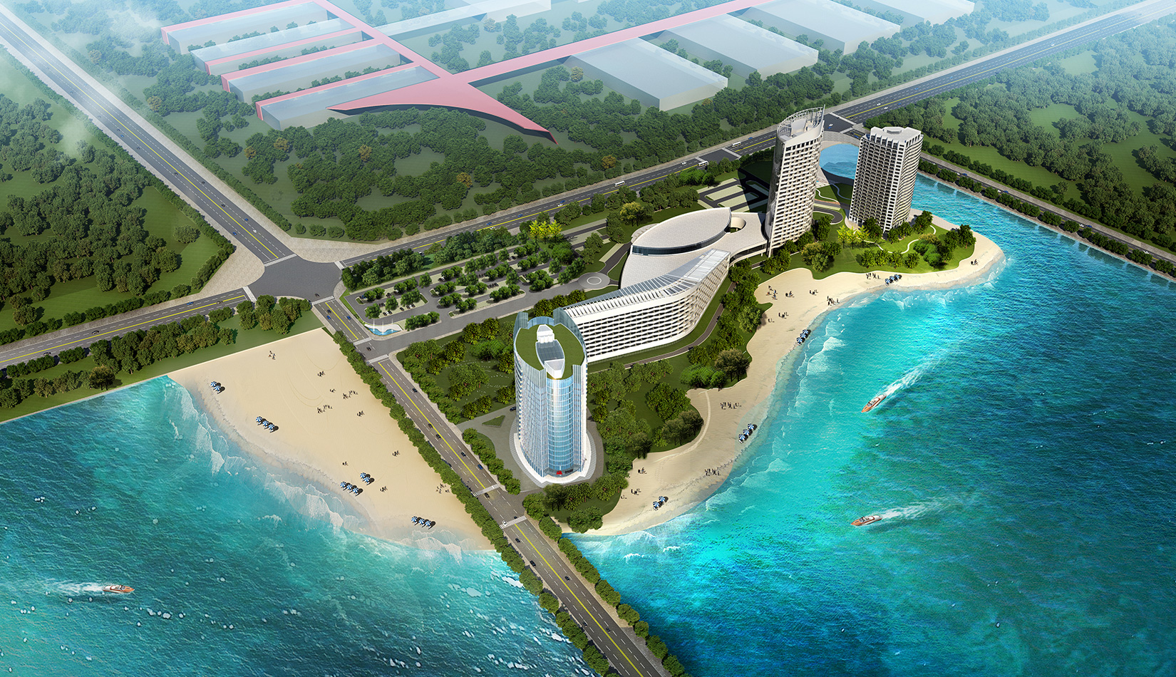 項目充分考慮酒店一期建筑及其對空間、道路、周邊環(huán)境的影響,盡量將二期建筑順勢布置,與一期形成完整的有機整體;將局促且形狀不規(guī)則的用地進行合理組織,使建筑、道路、景觀得到恰當的安排;與一期建筑相對獨立,又能夠共享景觀、道路等資源,達到使用上的便捷、舒適;在滿足建筑功能及使用的前提下,盡量減少建筑的高度、長度、突出一期的主導地位,是對整個環(huán)境的補充和完善,提升土地價值和環(huán)境品質。