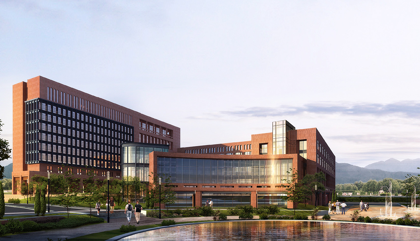 總體的規(guī)劃布局圍繞中心景觀(guān)廣場(chǎng)展開(kāi)設(shè)計(jì)。首先從山區(qū)建筑布局師法自然,藏風(fēng)聚氣的傳統(tǒng)觀(guān)念出發(fā),結(jié)合現(xiàn)代科學(xué)嚴(yán)謹(jǐn)求真務(wù)實(shí)的態(tài)度,設(shè)計(jì)以東側(cè)入口廣場(chǎng)導(dǎo)入的中心景觀(guān)空間圍合展開(kāi)規(guī)劃布局,總體上根據(jù)土地的使用性質(zhì)分為四個(gè)區(qū),分別是正對(duì)主入口北側(cè)的生活區(qū),南側(cè)的孵化中心區(qū),正對(duì)主入口廣場(chǎng)的科研辦公區(qū),以及整個(gè)用地最南端的產(chǎn)業(yè)開(kāi)發(fā)區(qū),各個(gè)區(qū)既相互獨(dú)立同時(shí)又緊密聯(lián)系,功能上即考慮主導(dǎo)風(fēng)向又方便使用。