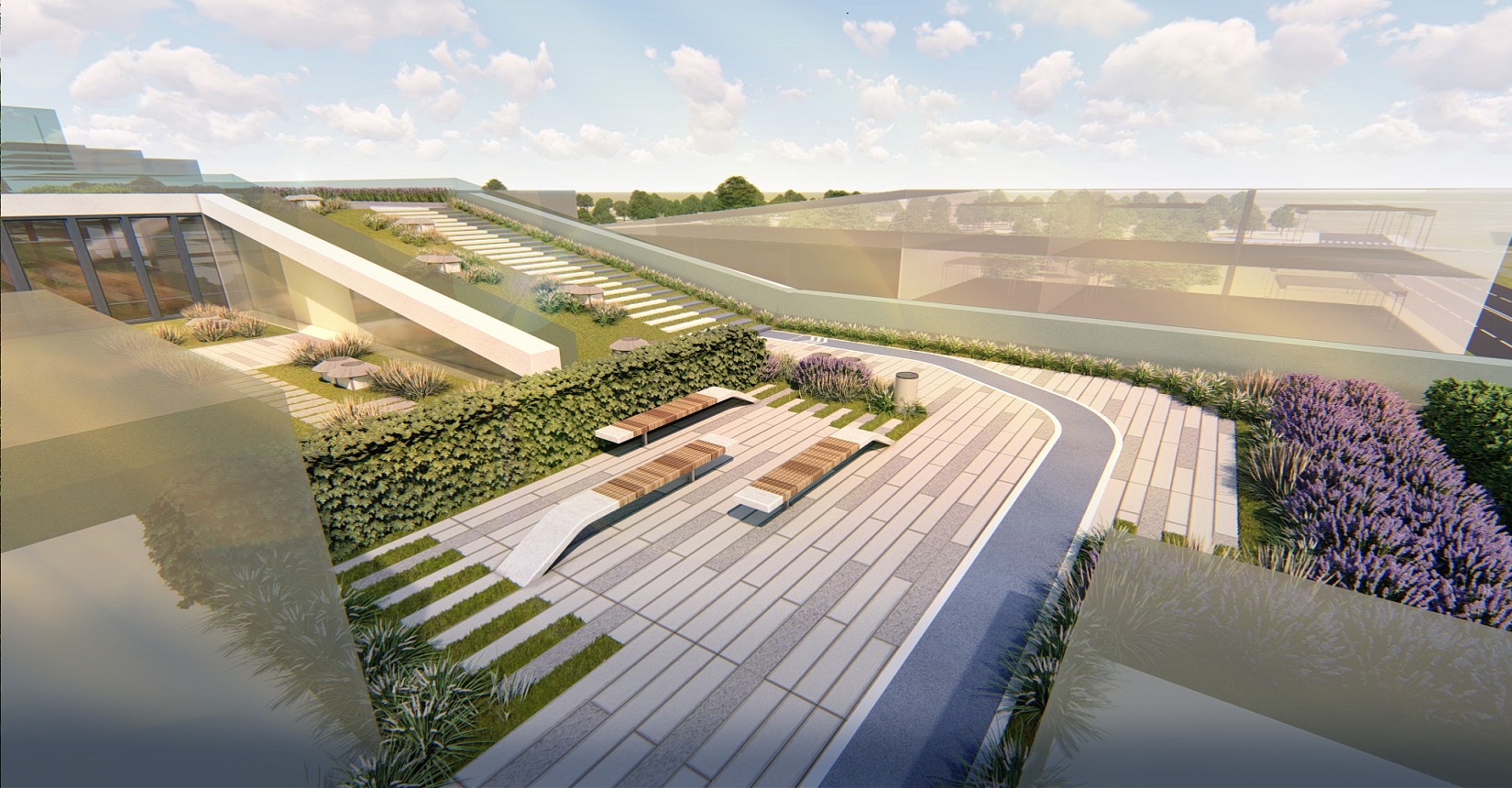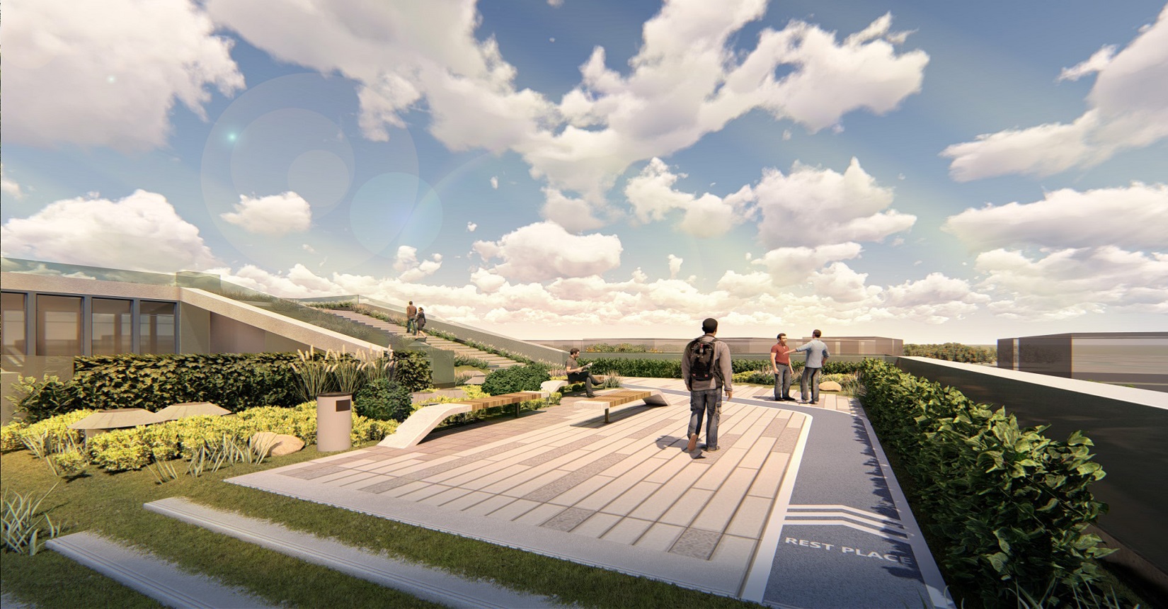 強(qiáng)調(diào)室內(nèi)空間和室外空間的融合,利用屋面打造慢行系統(tǒng),使建筑成為公園的組成部分,將公園景觀引入建筑當(dāng)中,打造具有標(biāo)志性的城市客廳、一個(gè)戶外生態(tài)客廳、原生態(tài)的生活空間,鼓勵(lì)面對(duì)面的交流,員工之間的交流,員工與客戶的交流,鄰里之間的交流。使用一條流動(dòng)的能量線環(huán)形慢跑道,串聯(lián)整個(gè)空間傳達(dá)先進(jìn)、高能量與流動(dòng)的整體形象。